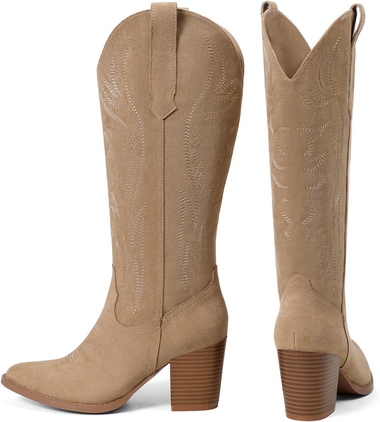 AOSPHIRAYLIAN Cowboy Boots for Women Pointed Toe Knee High Cowboy Boots Women Wide Calf Cowgirl Western Embroidery Pull On Chunky Block High Heels Boot(Apricot)