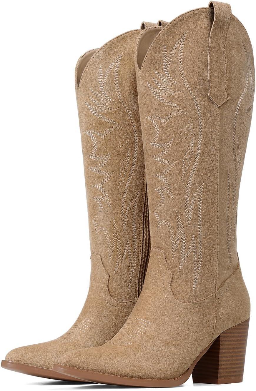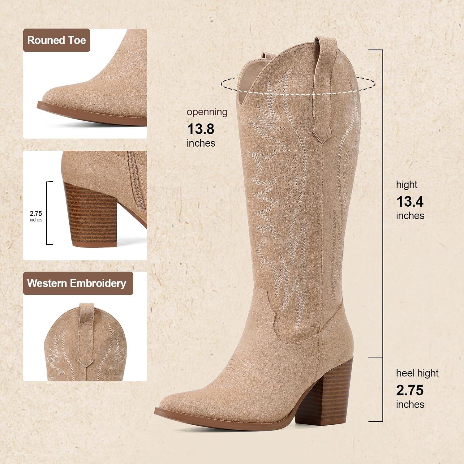 AOSPHIRAYLIAN Cowboy Boots for Women Pointed Toe Knee High Cowboy Boots Women Wide Calf Cowgirl Western Embroidery Pull On Chunky Block High Heels Boot(Beige)